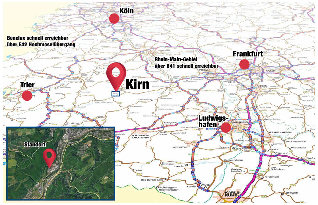 Das ehemalige Betriebsgelände befindet sich in einem Gewerbegebiet in Kirn.