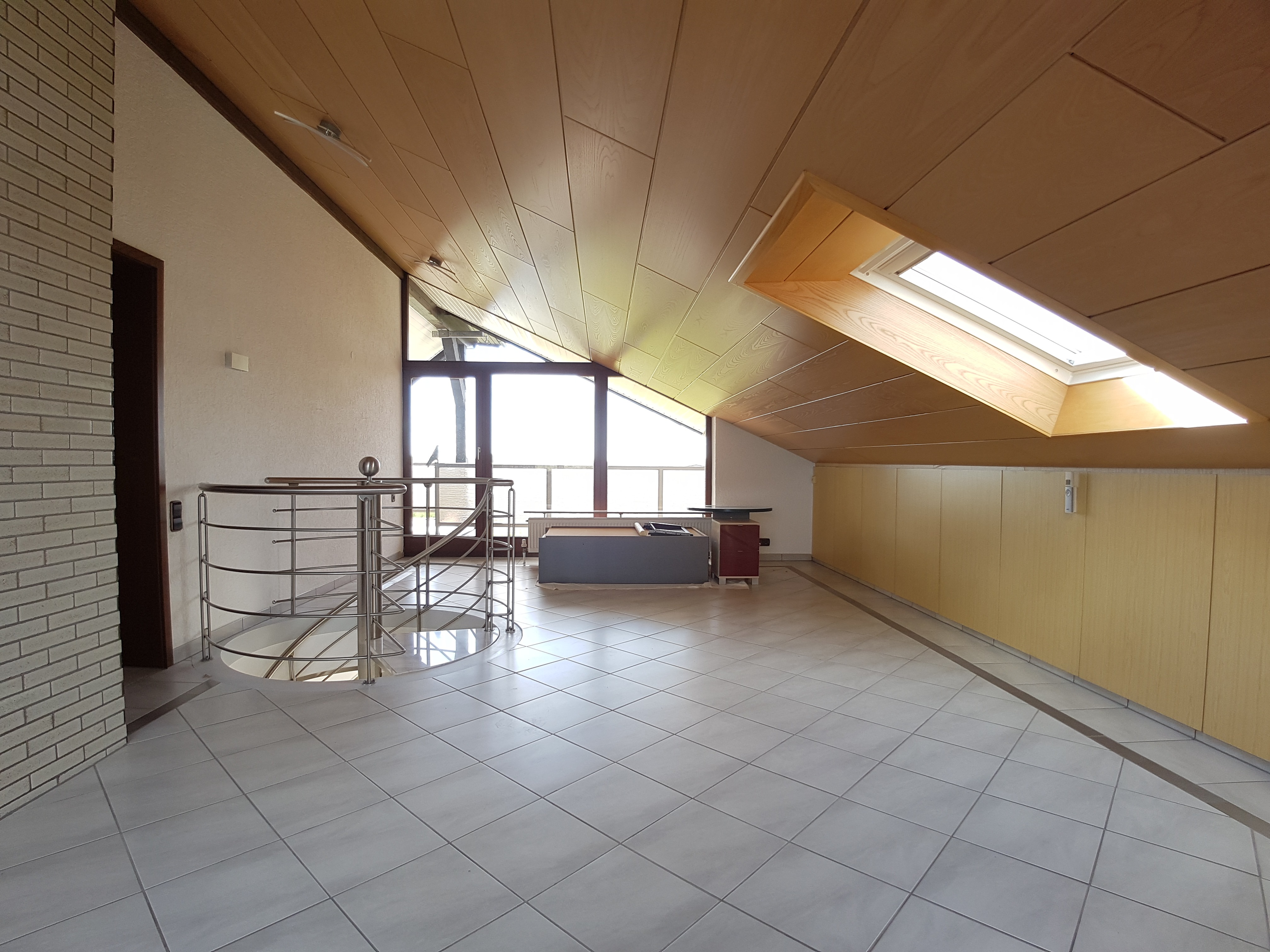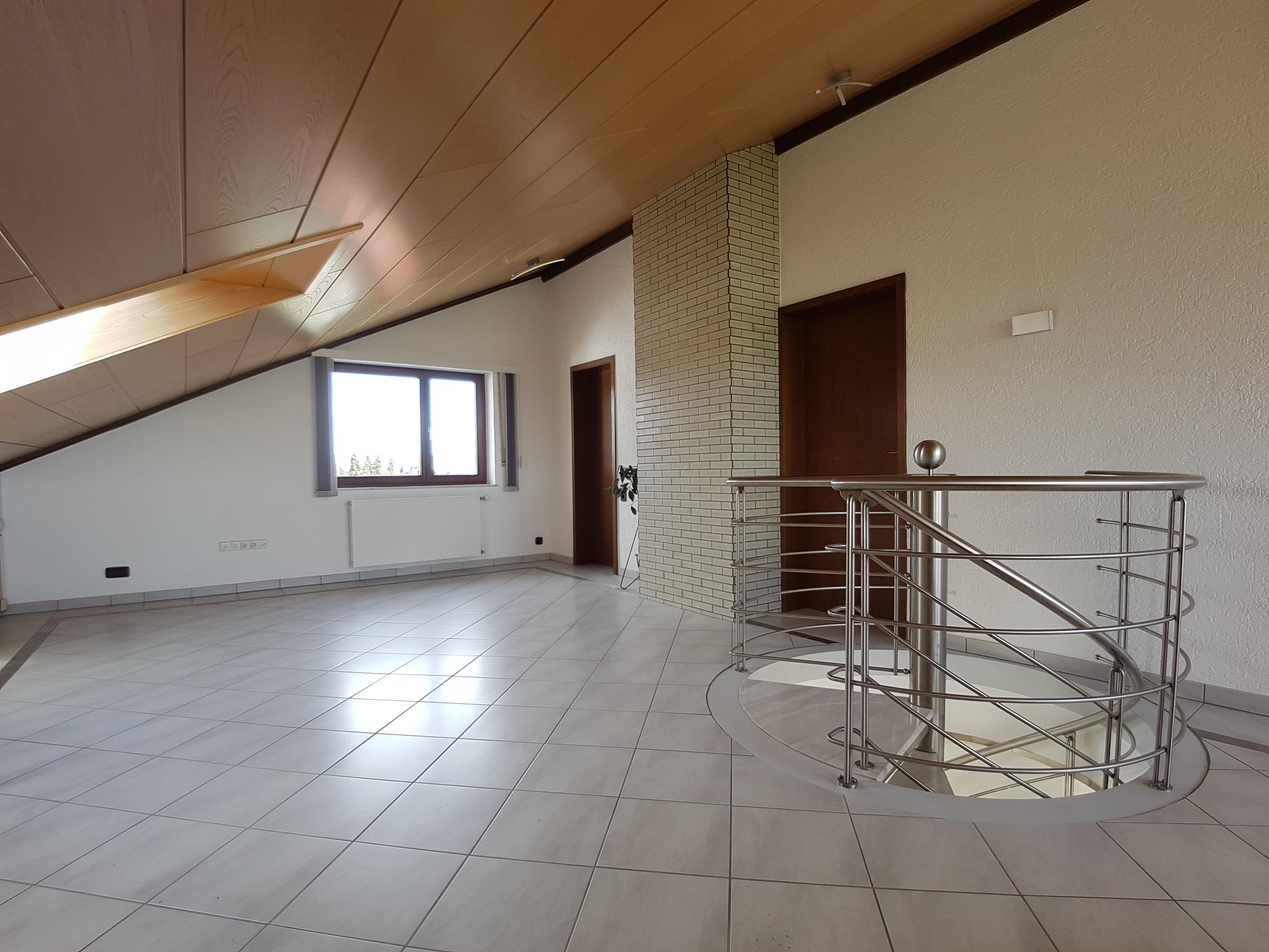 Über eine Wendeltreppe gelangt man in die zweite Etage (ausgebautes Dachgeschoss) in dem sich zwei weitere Wohnräume, eine weiteres Badezimmer mit Dusche und ein Balkon mit Blick in die Ferne befinden.