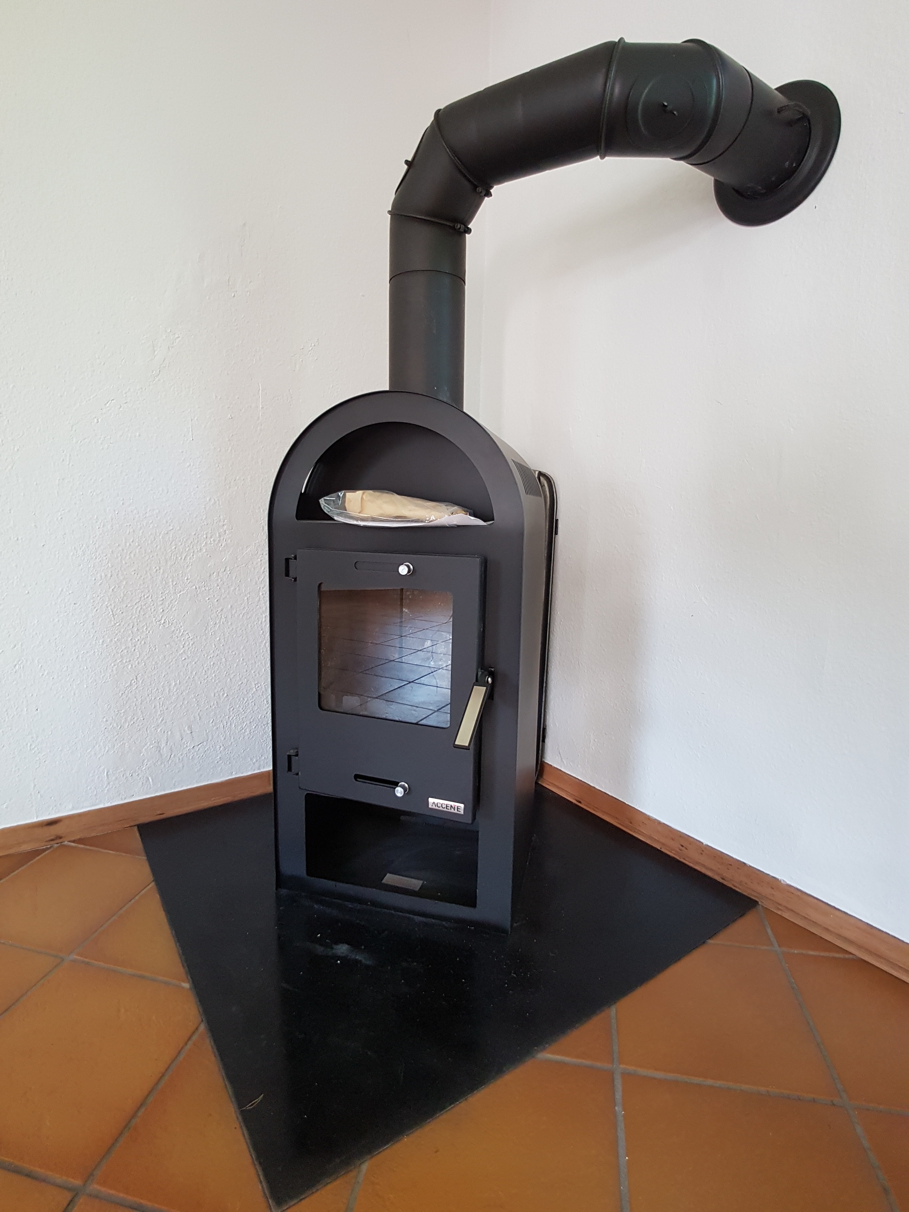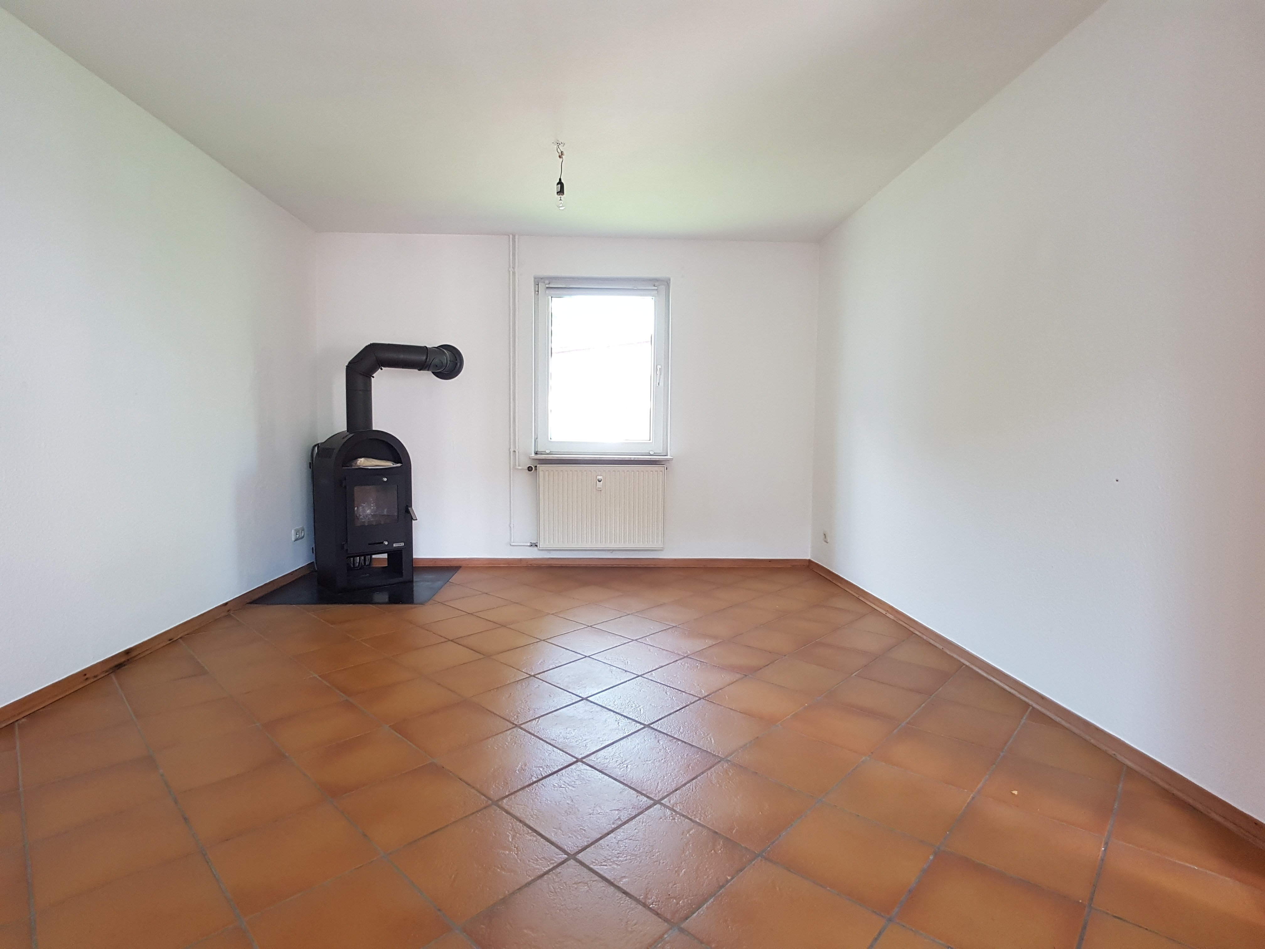 Das Wohnzimmer ist mit einem Kaminofen ausgestattet.