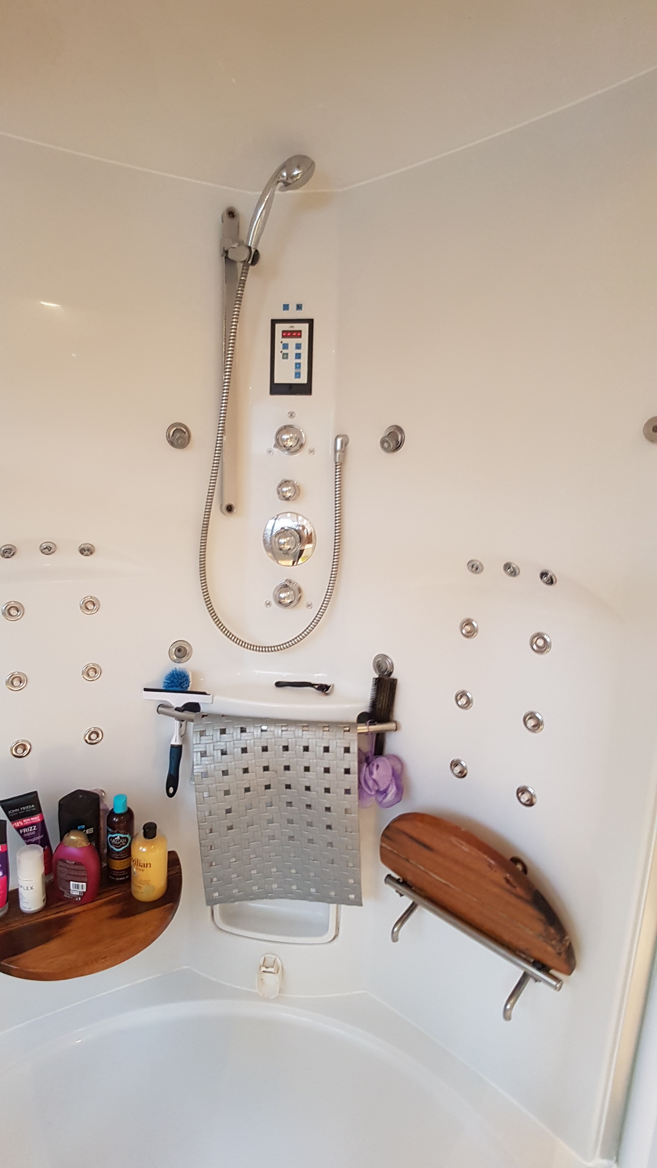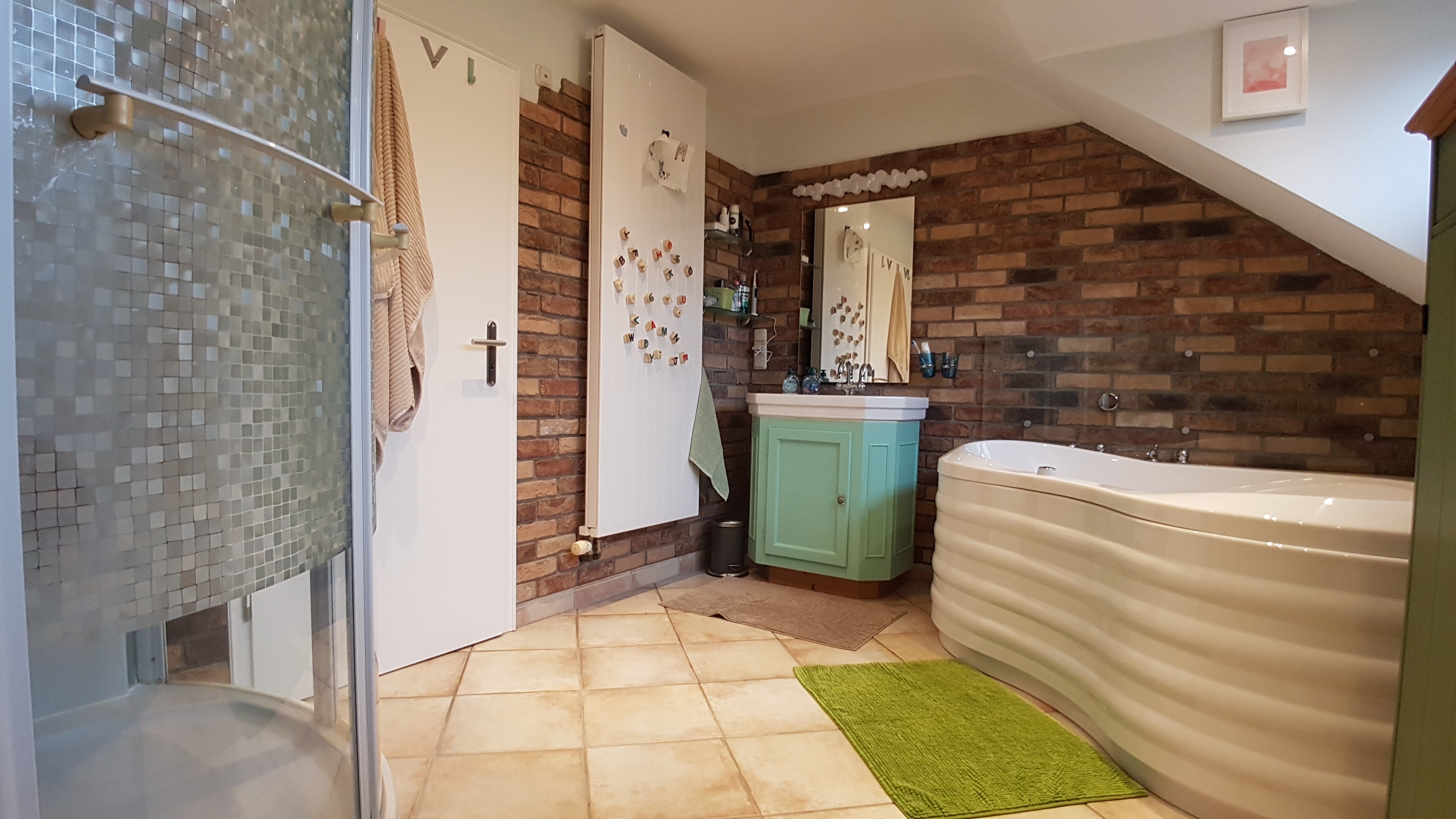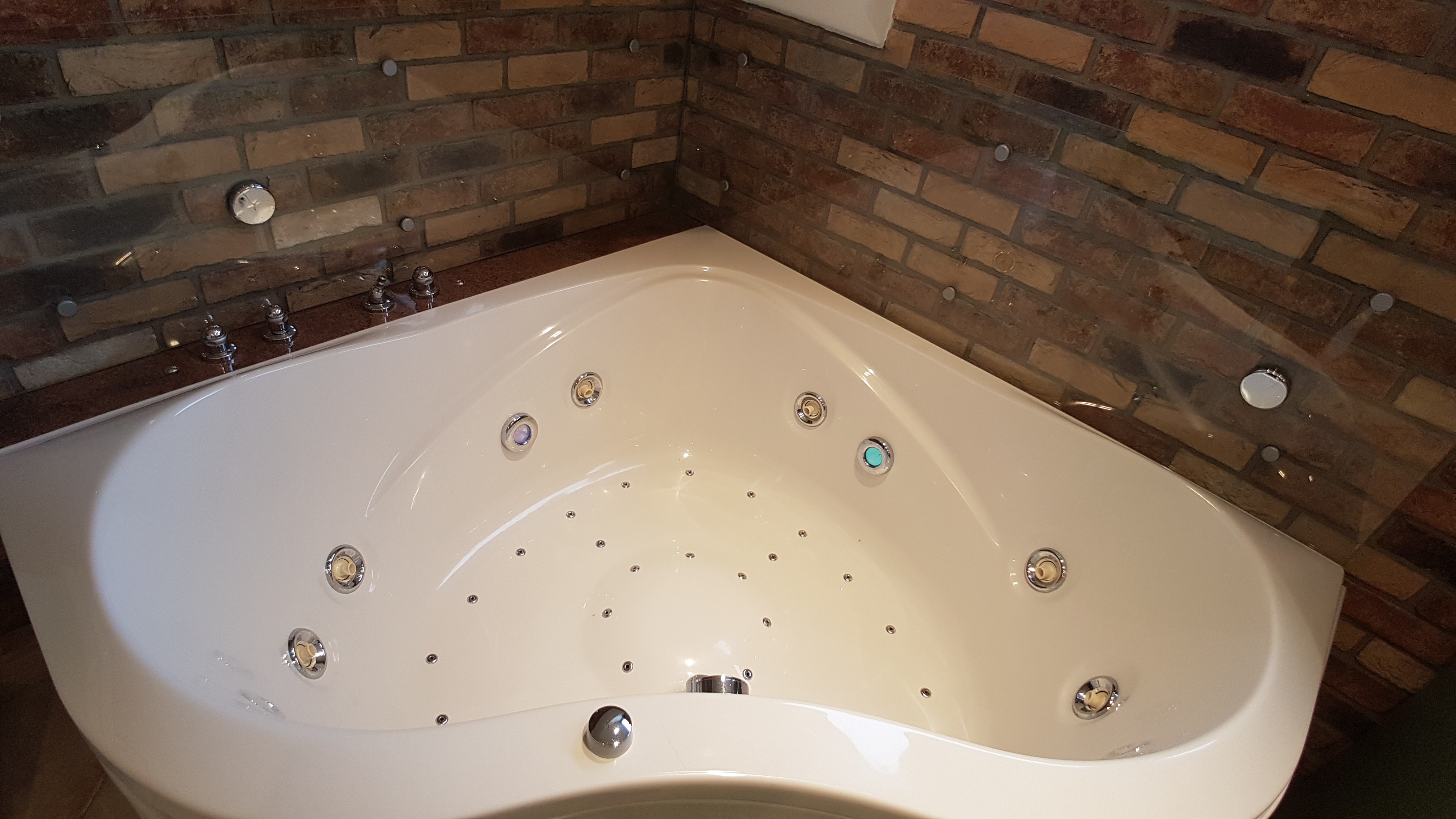 Das Badezimmer präsentiert sich als Wellnessoase. Mit einer großzügigen Dusche mit Massagefunktion und einer Whirlpoolbadewanne bietet es den perfekten Raum zur Entspannung.