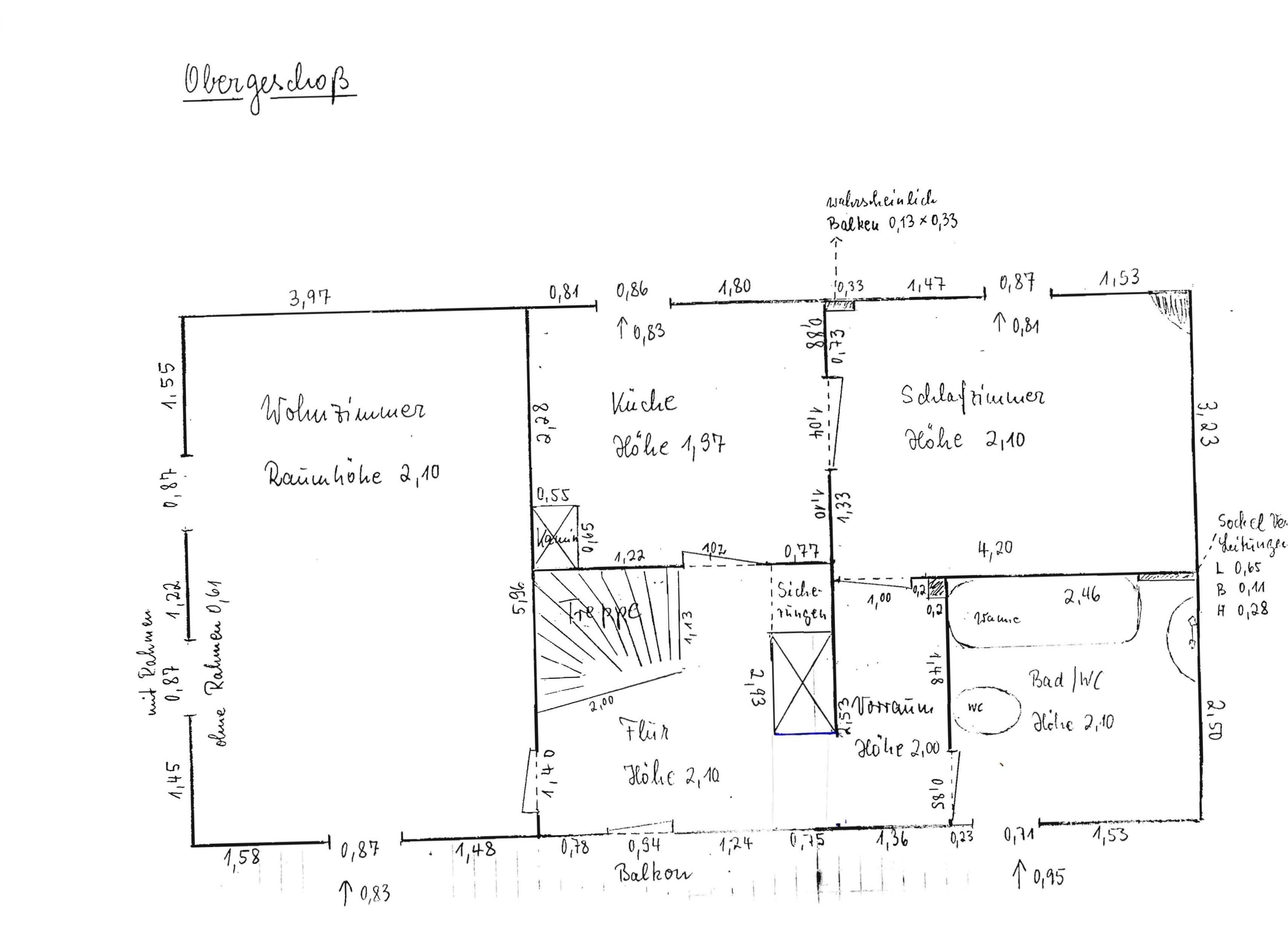 Im Obergeschoss: Flur mit Zugang zum Balkon, Wohnzimmer, Küche, Schlafzimmer, Vorraum (Flur), Badezimmer mit Badewanne und Balkon.